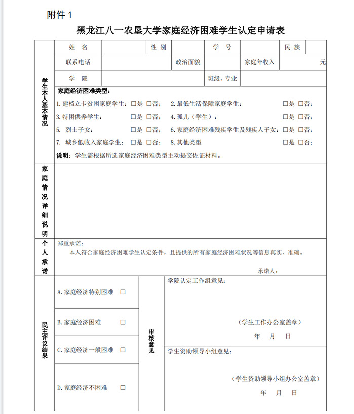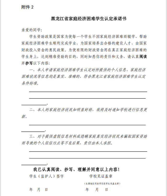 (一)提前告知。每年 6 月,公司为员工发放《黑龙江八一农垦大学家庭经济困难员工认定申请表》(以下简称申请表),提前告知家庭经济困难员工认定工作事项,并做好资助政策的宣传工作。