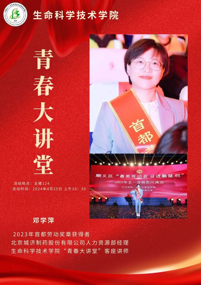 为进一步提升员工的职业生涯规划意识,深入了解生物医药行业发展趋势,科学认识职业发展规律,制定合理的预期目标和阶段规划,不断提升职业素养和专业技能力,4月25日上午,学院在主楼124教室举行了第八期“青春大讲堂”,本次讲座特别邀请到2023年“首都劳动奖章”获得者、北京诚济制药股份有限公司人力资源部经理邓学萍作为主讲嘉宾。