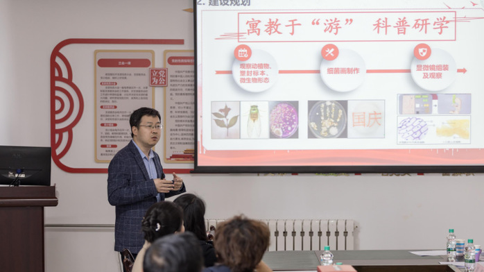 依托生物学基础实验教学中心,如何设计开展寓教于“游”的科普研学活动?黑龙江八一农垦老员工物学基础实验教学中心主任刘权,先是介绍了实验室的基本情况,随后,依据小学、初高中不同学段,逐一介绍了动植物和塑封标本观察、细菌画制作、显微镜组装及观察等具体做法。