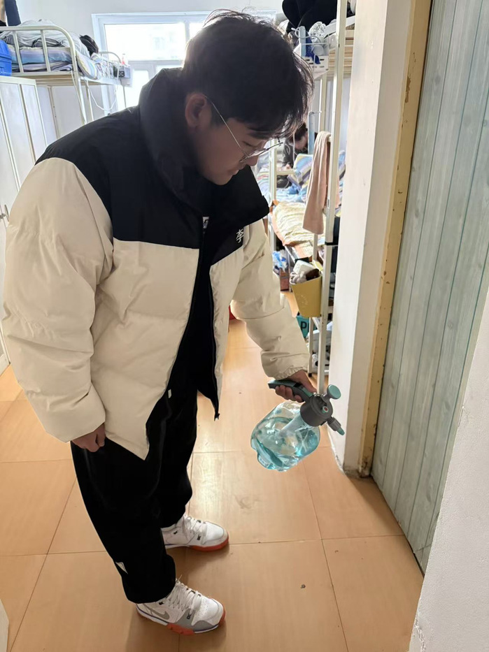 消杀人员以不留死角为原则,对寝室的各个角落,包括寝室、走廊、卫生间等区域进行了全面细致的喷洒消毒液,喷洒过后,小组成员又进行30分钟开窗通风处理,在消杀过程中,工作人员还对寝室卫生状况进行了检查,同时,他们向同学们宣传了卫生防疫知识,强调了保持寝室清洁、通风良好的重要性,鼓励大家积极配合学校的防疫工作,共同维护校园公共卫生安全。