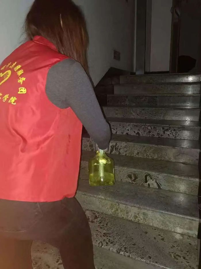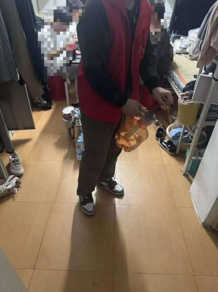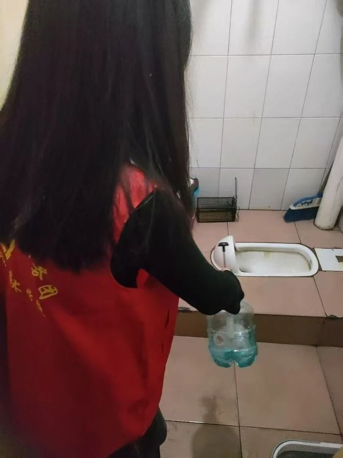 消杀工作于晚上九点半启动,志愿者对寝室、走廊、公共洗漱区、门把手等高接触区域进行重点消杀,采用含氯消毒液进行喷洒与擦拭,确保不留死角,并对寝室通风、垃圾清理等事项进行了科普。