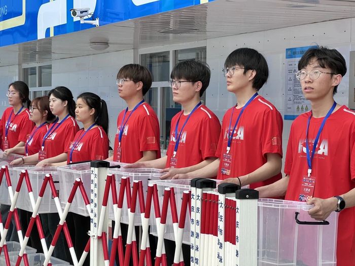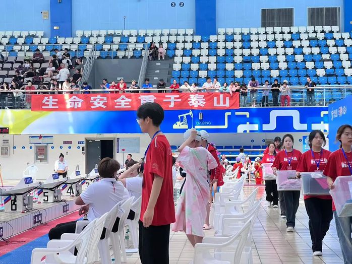 志愿服务团队主要负责赛前检录、引导入场、转运等工作。检录员检查参赛资格,登记号码;引导员带领运动员到对应泳道;转运员待命行动,调配人员及物资;领取处志愿者提供服务、解答疑问、发放物品。