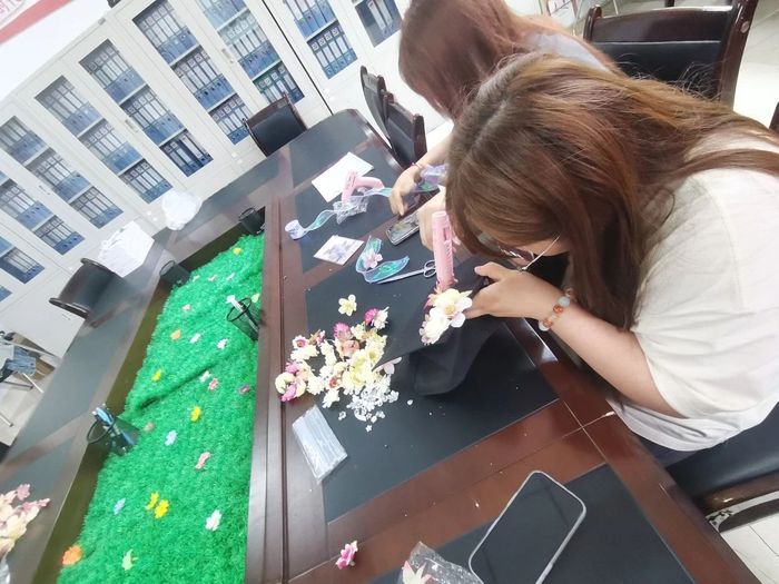 活动现场,同学们沉浸在手工创作的乐趣中,或凝神构思,或精心雕琢,彼此之间还不时交流着心得与创意。一朵朵精美的花朵在指尖绽放,在欢声笑语中,原本普通的学士帽逐渐变得灵动而富有生气,成为了一件件独一无二的青春微缩景观。