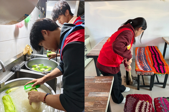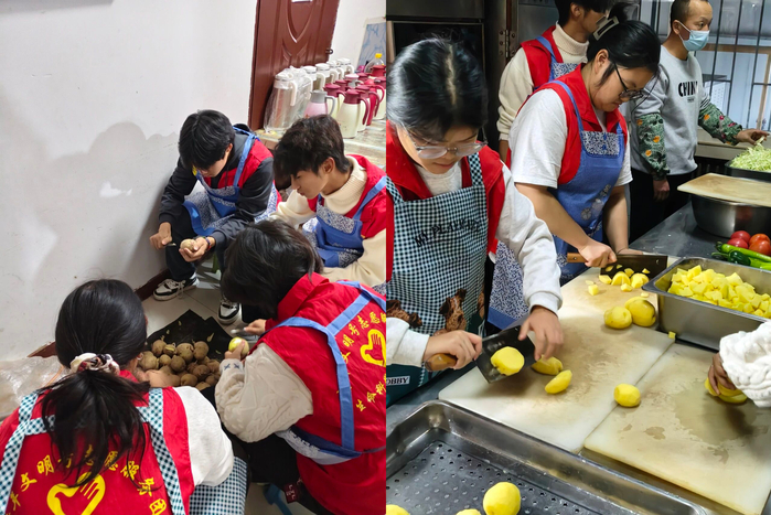 活动当天,志愿者们提前做好准备,有条不紊完成洗菜、切菜、削皮等午餐备餐工作,同时认真细致打理室内外环境,全方位改善用餐环境。