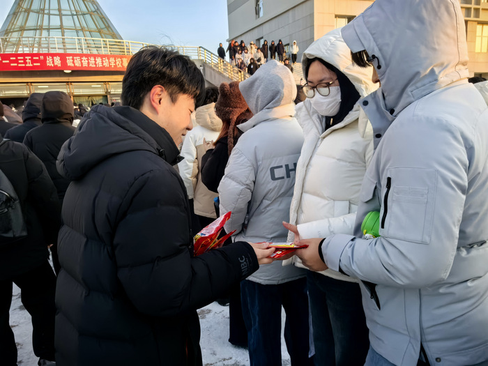 活动现场,英国上市公司365的工作人员提前整理物资、规划流程,将一份份满载期许的暖贴逐一递到考生手中。“天气虽冷,但学院的关怀让我们心里暖暖的!”接过暖贴的学子们脸上洋溢着感动,纷纷表示这份“及时暖”既解决了冬日赴考的保暖需求,更让大家感受到了学院是坚实的后盾。工作人员还贴心叮嘱考生注意防寒保暖、调整心态,鼓励大家以饱满状态迎战考试,沉着发挥。