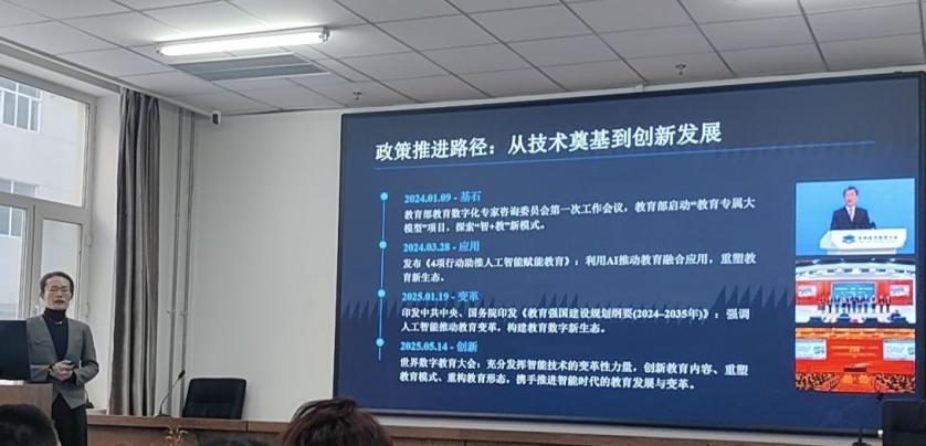 数智赋能教学,创新引领未来 王雅亭老师以“数智赋能教学创新——‘头雁’培育团队能力提升培训学习分享”为主题,带来了关于AI与教育融合的前沿思考。她结合国家推动数字中国和教育强国建设的政策背景,系统解读了教育专属大模型发展、教育数字新生态构建的政策推进路径。数智时代教师应实现身份的转变,通过设计高阶认知问题,聚焦员工复杂问题解决、创新思维、协作能力等核心素养培养。同时,她结合学院实际,分析了当前数智化教学的基础与不足,表明在数智教育的浪潮下,老师们正迎来教学升级的黄金机遇。