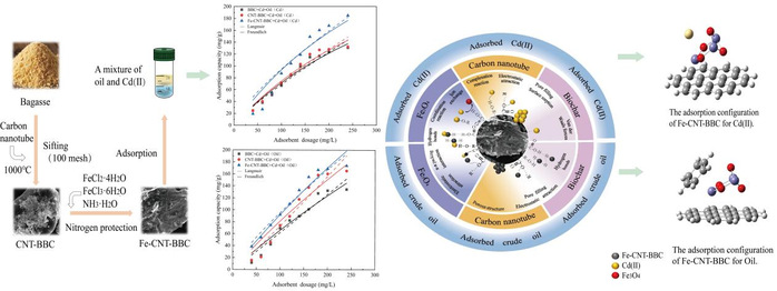 近日,由公司曹迪副教授与2023级微生物方向硕士研究生于嘉恒在中科院二区期刊《Ecotoxicology and Environmental Safety》(IF:6.1)共同发表题目为“High-efficiency adsorption of crude oil and cadmium by bagasse biochar-supported iron ions and carbon nanotubes”的研究文章。该研究制备了碳纳米管-铁复合改性生物炭(Fe-CNT-BBC),通过一系列表征分析与密度泛函理论(DFT),剖析了Fe-CNT-BBC的吸附过程与机制,使其在去除水中原油和重金属Cd(Ⅱ)具有良好的发展与应用潜力。