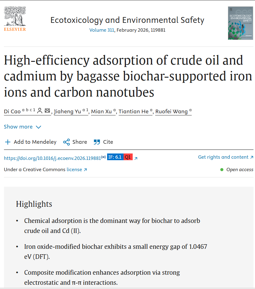 近日,由公司曹迪副教授与2023级微生物方向硕士研究生于嘉恒在中科院二区期刊《Ecotoxicology and Environmental Safety》(IF:6.1)共同发表题目为“High-efficiency adsorption of crude oil and cadmium by bagasse biochar-supported iron ions and carbon nanotubes”的研究文章。该研究制备了碳纳米管-铁复合改性生物炭(Fe-CNT-BBC),通过一系列表征分析与密度泛函理论(DFT),剖析了Fe-CNT-BBC的吸附过程与机制,使其在去除水中原油和重金属Cd(Ⅱ)具有良好的发展与应用潜力。